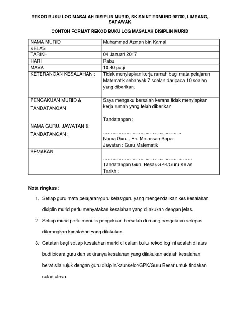 Format Rekod Buku Log Masalah Disiplin Murid Pdf