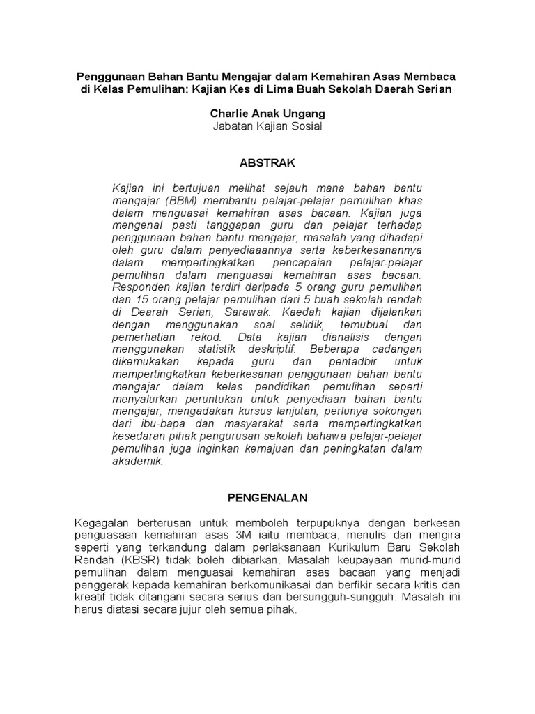 Penggunaan Bahan Bantu Mengajar Dalam Kemahiran Asas Membacadi Kelas Pemulihan Kajian Kes Di Lima Buah Sekolah Daerah Serian