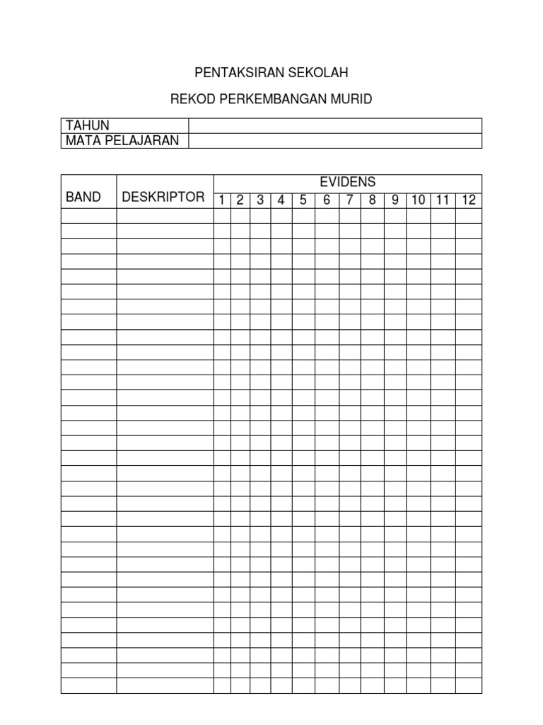 Pentaksiran adalah proses pengumpulan maklumat tentang perkembangan dan kemajuan murid dengan menggunakan pelbagai kaedah. Kepentingan Rekod Perkembangan Murid Sains Tahun 1 6. Di ruangan ini menyediakan bahan² seperti borang pentaksiran senarai semak borang rekod perkembangan murid lain² lagi yang berkaitan dengan pentaksiran murid untuk KSSR.